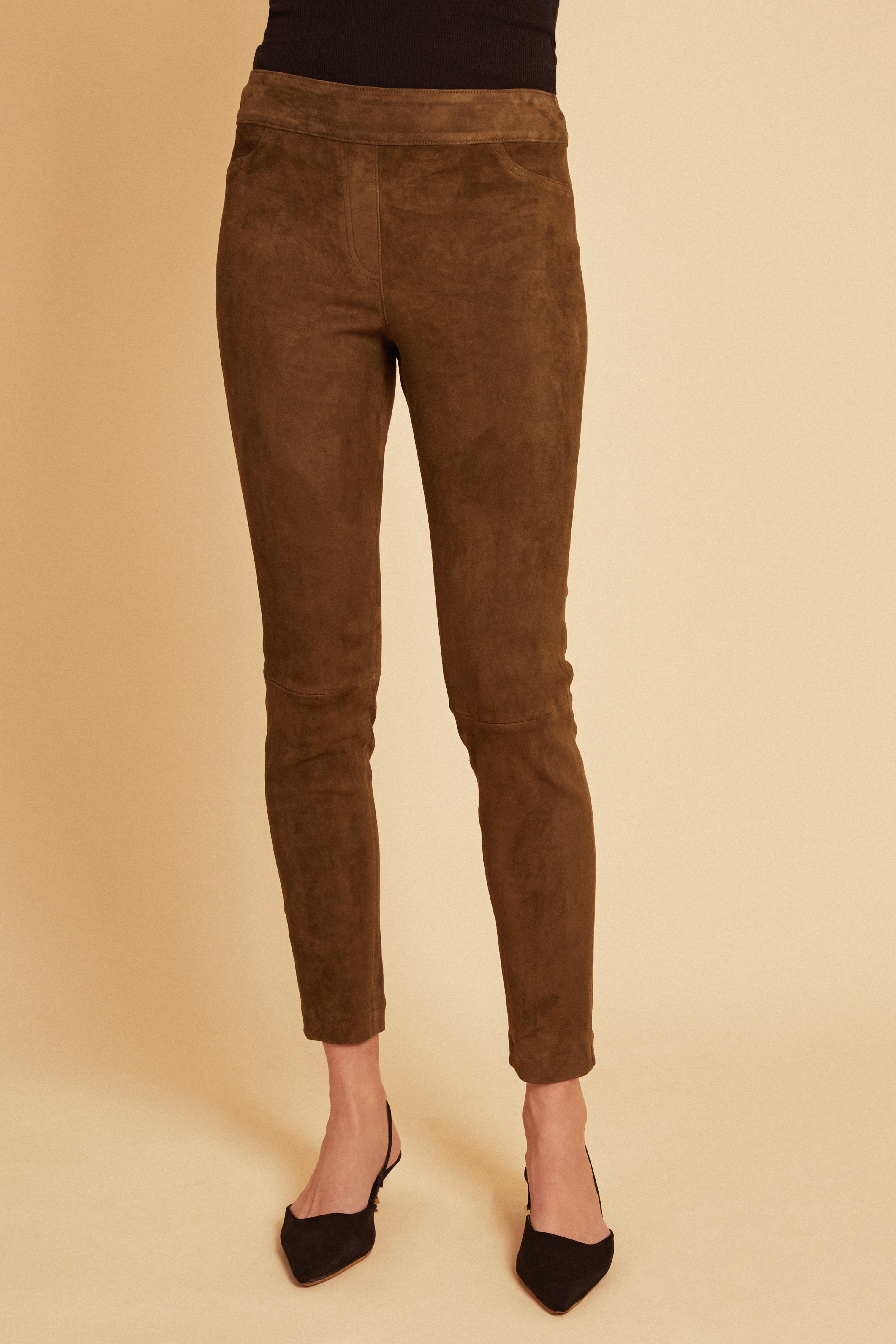 Introducing our luxurious Stretch Suede Leggings, crafted with Italian suede leather imported directly from Italy. Designed and made in the heart of NYC, these leggings exude sophistication and style. The rich olive green hue adds a touch of elegance to any outfit, making them a must-have addition to your wardrobe. With their sleek and stretchy design, these leggings are perfect for dressing up or down, making them versatile enough for any occasion. Experience the ultimate in luxury with our Stretch Suede Leggings.