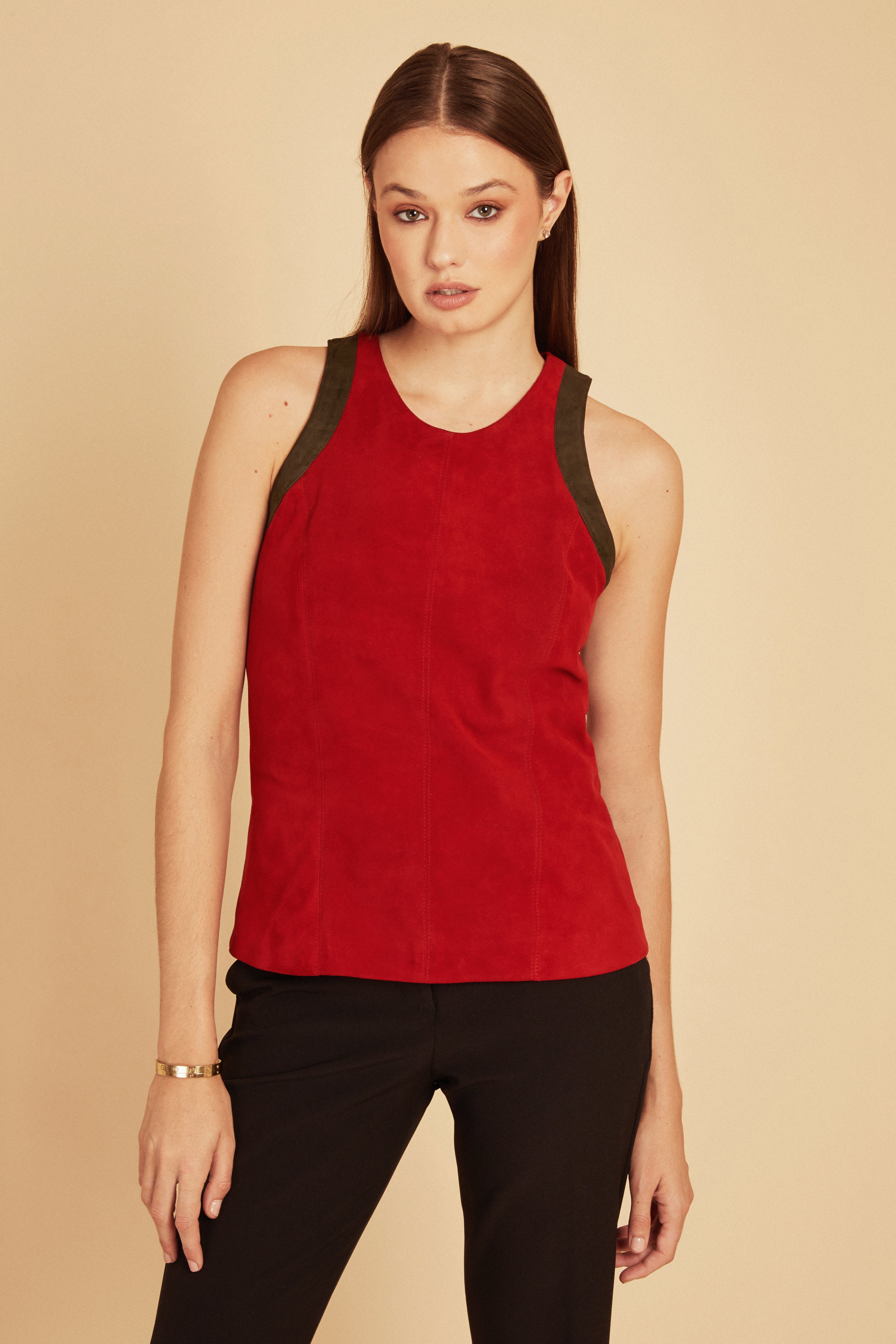 A vibrant Red Stretch Suede vest that perfectly blends bold color with comfortable flexibility. Crafted from soft, high-quality suede, it offers a sleek, fitted silhouette that enhances your shape while allowing ease of movement. Ideal for adding a pop of color and texture to any outfit, or for layering. This vest is both stylish and versatile, making it a statement piece for any wardrobe.