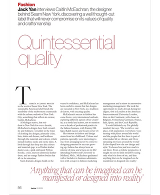 International coverage spotlighting Caitlin McEachran’s Midwest-to-New York perspective, bold materials, and empowering silhouettes.